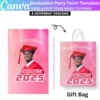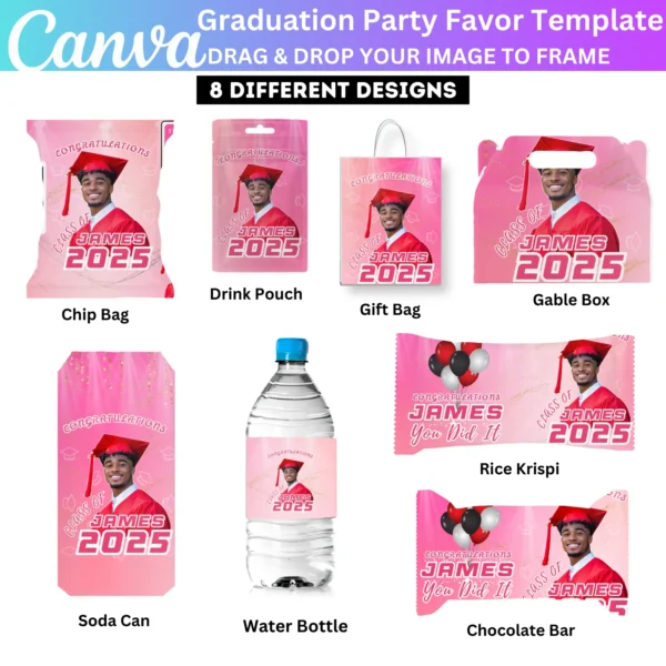 Create personalized 08 Graduation Party Favor Canva Editable Template with ease. Customize baby pink-themed treat bags, water labels, chip bags, gable boxes, and wrappers using Canva’s easy drag-and-drop feature. Perfect for making memorable party favors for your graduation.