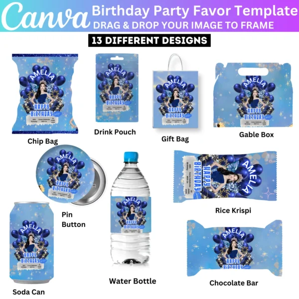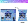 This Blue Birthday Treat Party Favor Bundle includes editable templates for water labels, chip bags, and wrappers. Create fun, personalized packaging for party favors and make your birthday celebration even more special with these customizable digital designs.
