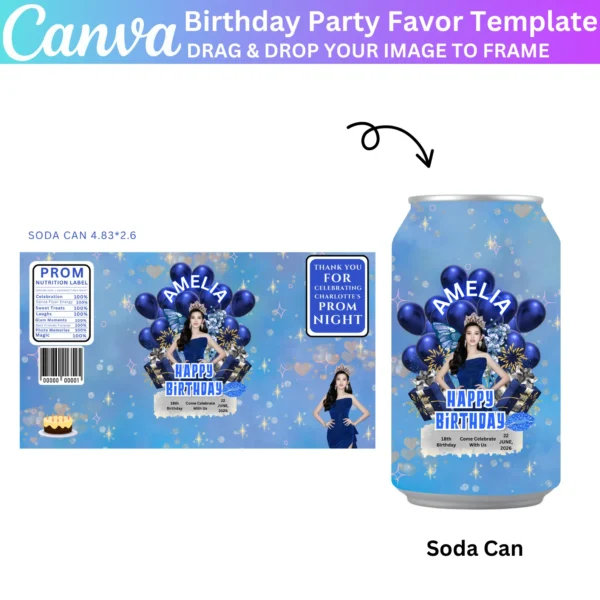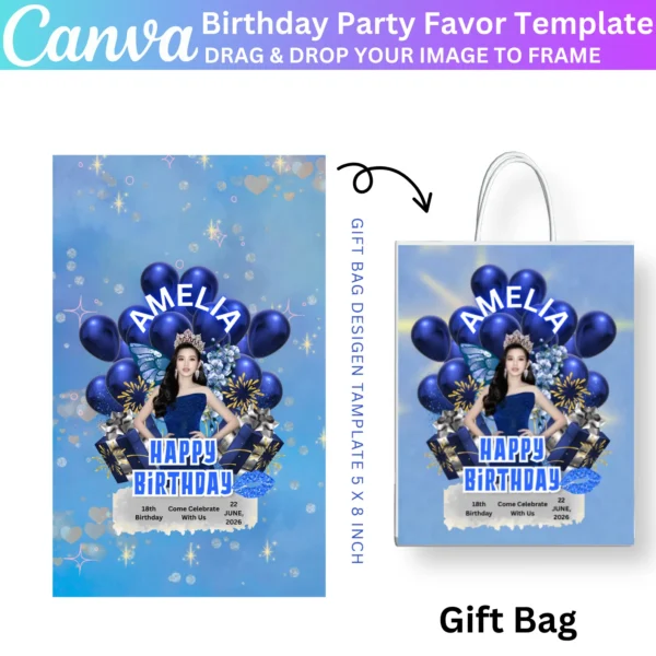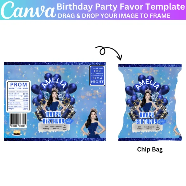 Create a stunning celebration with the 10 Canva Editable Birthday Party Favor Template. Customize your blue-themed treat bags, water labels, chip bags, and wrappers using Canva’s easy drag-and-drop feature. Perfect for adding a personalized touch to your birthday event.