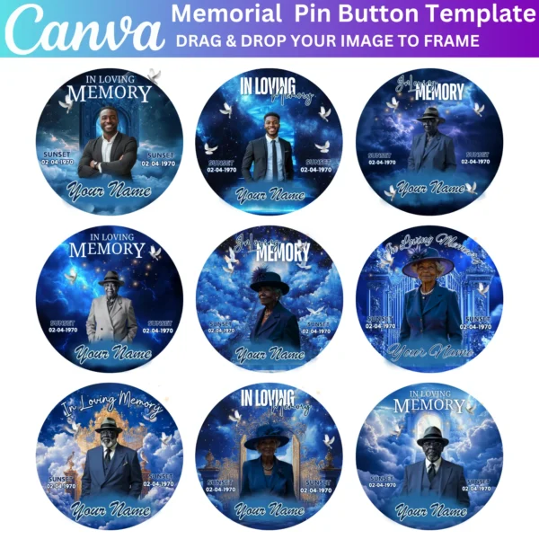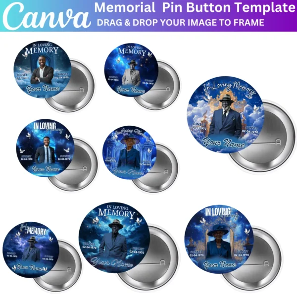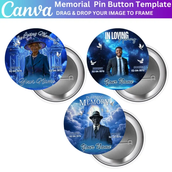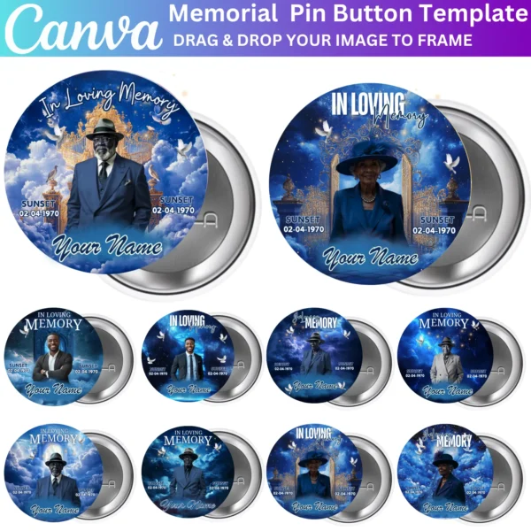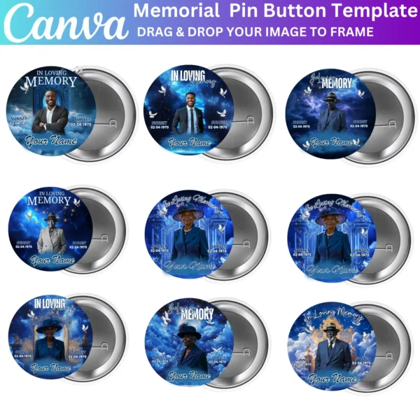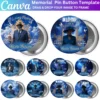 Create a heartfelt tribute with these 10 In Loving Memory Blue Pin Button Canva Editable Templates. Customize the design with text, photos, and meaningful messages to create personalized memorial buttons that can be worn as a keepsake.
