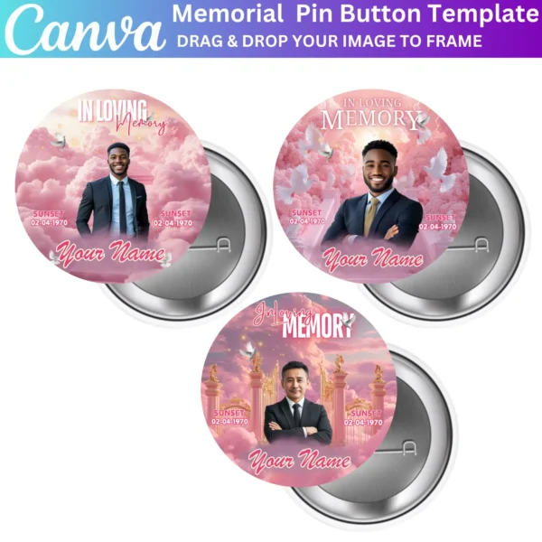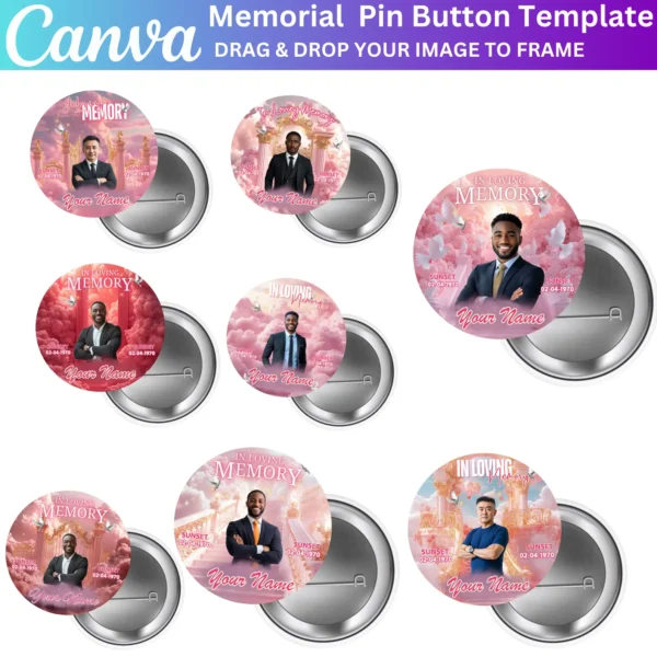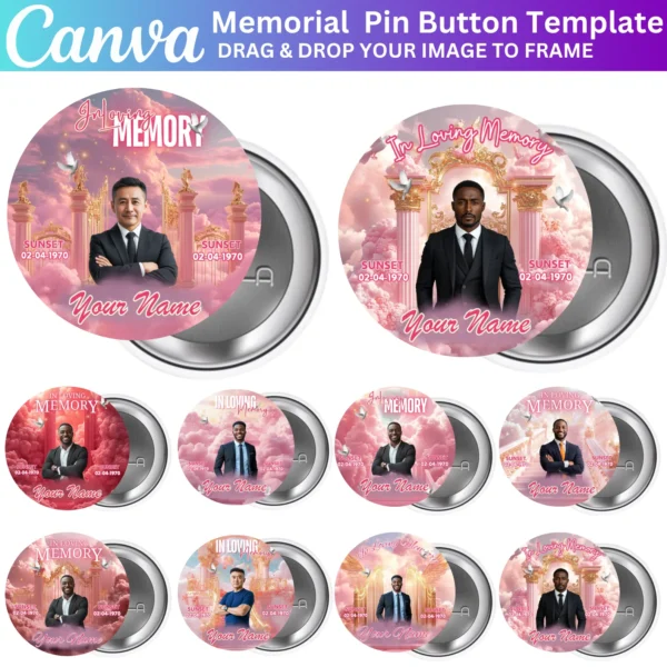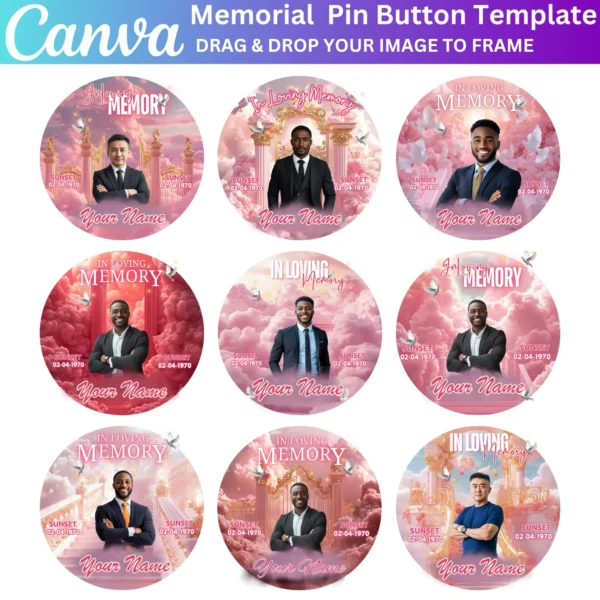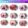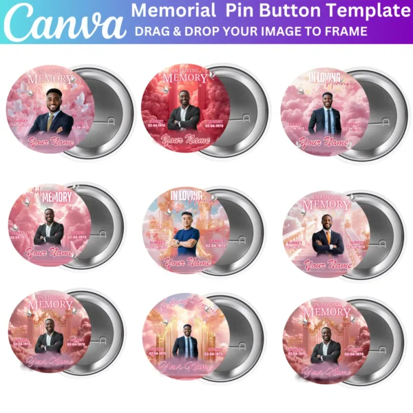 Honor the memory of a loved one with these 10 In Loving Memory Pink Pin Button Canva Editable Templates. Perfect for memorial services or remembrance events, these customizable buttons can be personalized with photos, names, and heartfelt messages to create a lasting tribute.