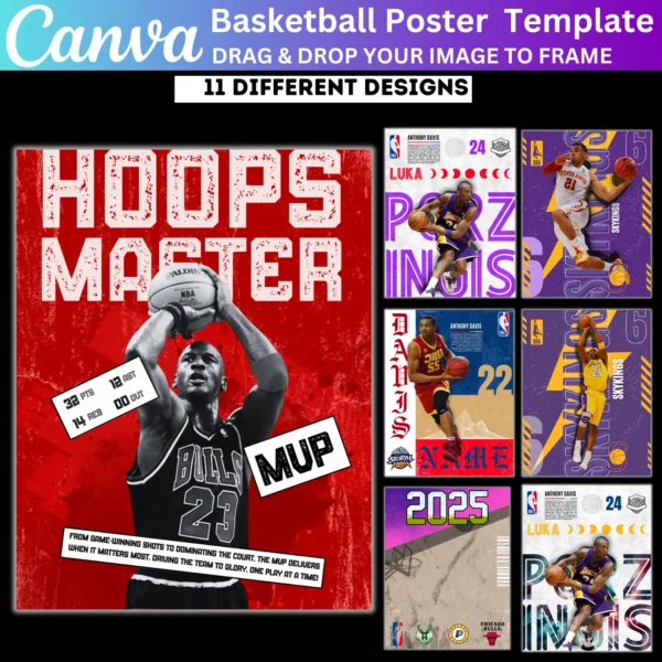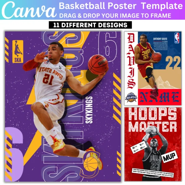 Celebrate the big game with this 11 Basketball Poster Canva Editable Template. Perfect for sports photography, these templates allow you to easily design basketball senior night banners and sports posters. Add your own photos, text, and team details to create stunning, personalized designs for the players and their families.