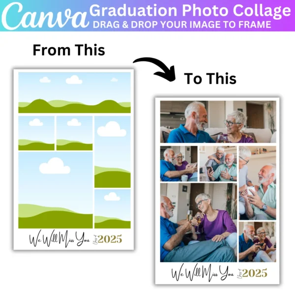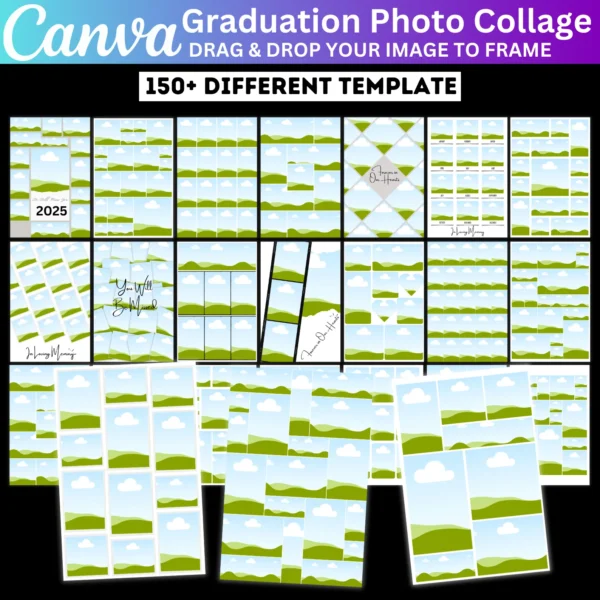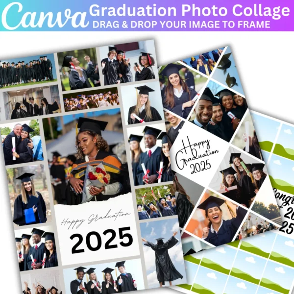 Create personalized graduation invitations with this 150+ editable Canva template bundle. Perfect for designing graduation cards and photo collages, this template allows you to customize with your graduate’s photos, text, and details for a unique invitation or keepsake.