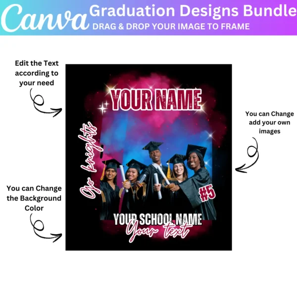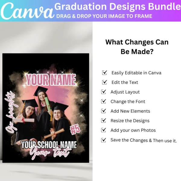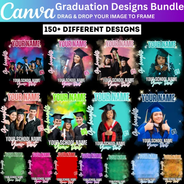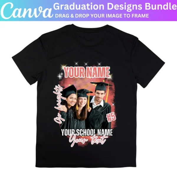 Design custom Graduation T-shirts for the Class of 2025 with this Canva Editable Template Bundle. Perfect for creating personalized Grad Bootleg Shirts. Easily customize with photos, names, and text to celebrate graduation day in style.