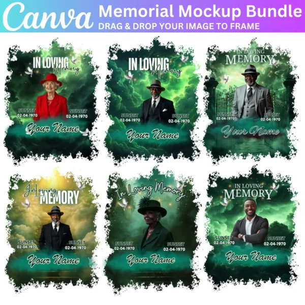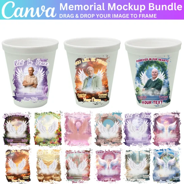 Create meaningful memorial party favors with this 150+ Green Memorial Party Favor Canva Editable Bundle. This extensive set includes editable templates for memorial mockup designs, pillow designs, grave blankets, pin buttons, ribbons, and memorial shirt templates. Fully customizable, these designs make it easy to add names, dates, photos, and messages to your memorial items.