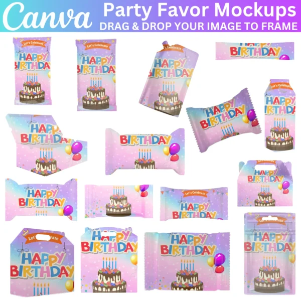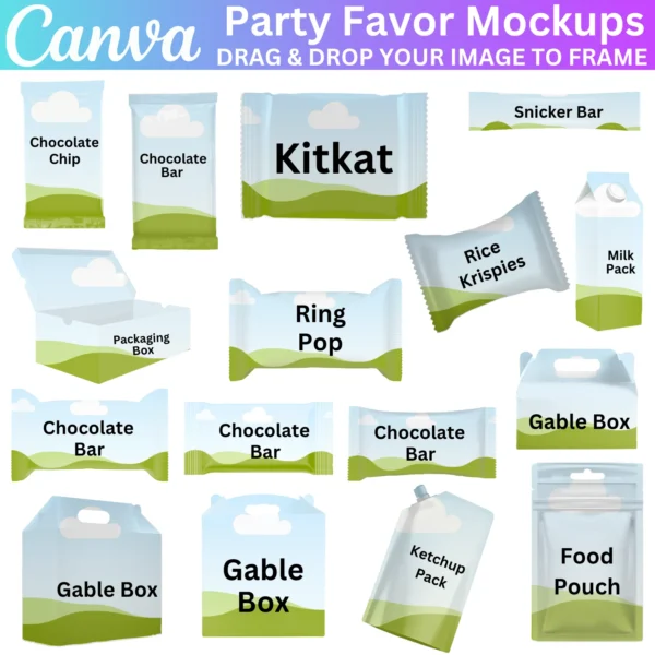 Elevate your party favors with the 20 Party Favors Canva Editable Template Bundle. This bundle includes editable templates for chocolate bars, chip bags, keychains, car coasters, hoodie mockups, and more. Customizable in Canva, you can easily personalize each item to create a cohesive theme for your special event. Perfect for birthdays, weddings, baby showers, or any celebration, these mockups provide a professional and creative way to present your party favors.