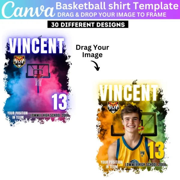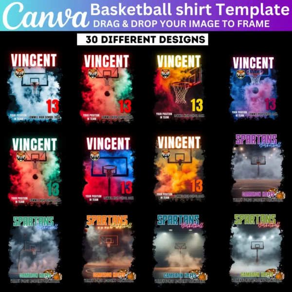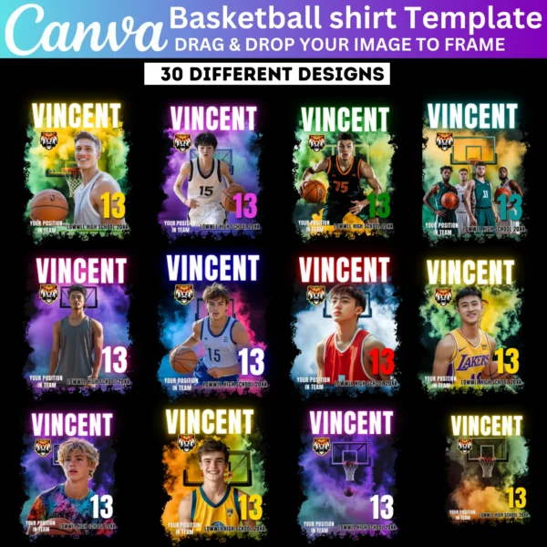 Celebrate your basketball team with the 30 Basketball Design Canva Editable Template. This bundle includes customizable sports bootleg t-shirt templates, perfect for creating personalized shirts for senior nights, team events, and tournaments. Whether for players or fans, these designs make it easy to create eye-catching apparel.