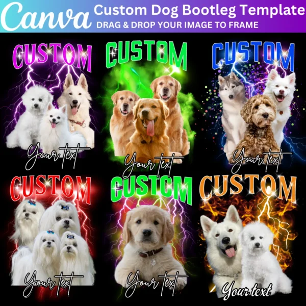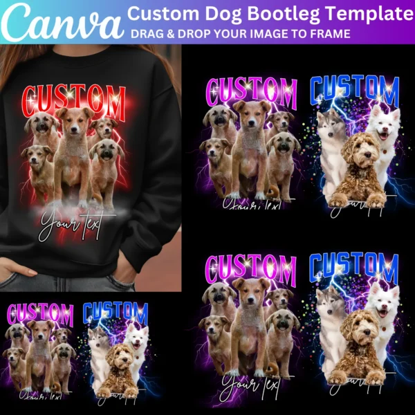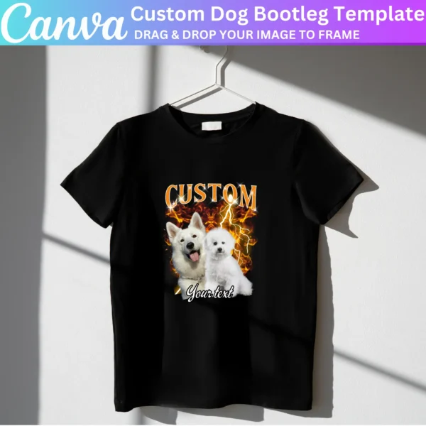 Create personalized Dog Bootleg Rap Tees with this Canva Editable Template. Perfect for dog lovers, birthday concerts, or custom pet merchandise. Easily add dog photos, text, and graphics to design unique shirts using Canva’s drag-and-drop tools.