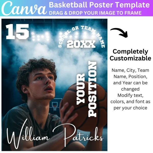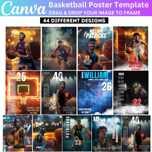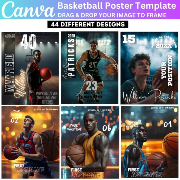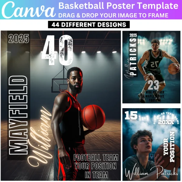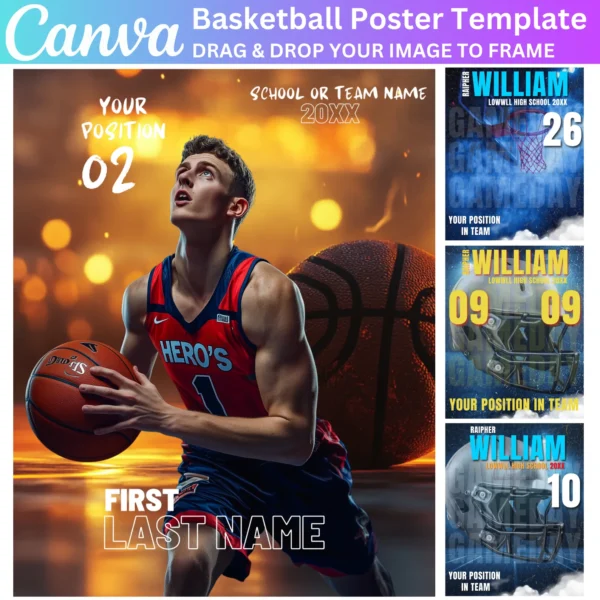 Create stunning Basketball Posters with this Canva Editable Template. Perfect for senior night banners, team events, and game day celebrations. Easily customize with player names, team logos, and photos using Canva’s drag-and-drop features for professional-quality designs.