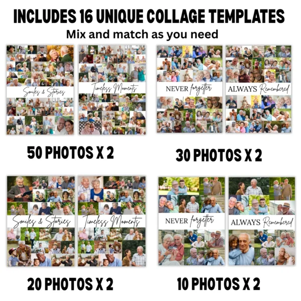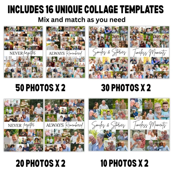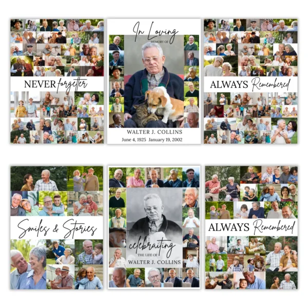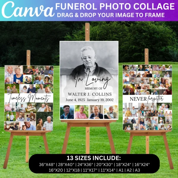 Create a heartfelt tribute with this Funeral Photo Collage Canva Template. Perfect for creating a memorial display sign or Celebration of Life poster, this template features 26 layouts and 13 sizes for customizing a beautiful tribute to your loved one.
