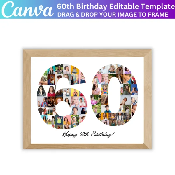 Celebrate a milestone birthday with the 60th Birthday Photo Collage Canva Editable Template. This customizable template allows you to design a personalized photo collage for a 60th birthday celebration, featuring a 60-number collage design and room for up to 70 photos. You can easily edit the template in Canva to add your photos, text, and personal messages to create a memorable birthday gift.