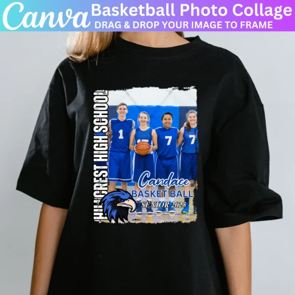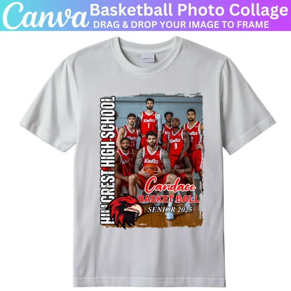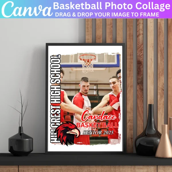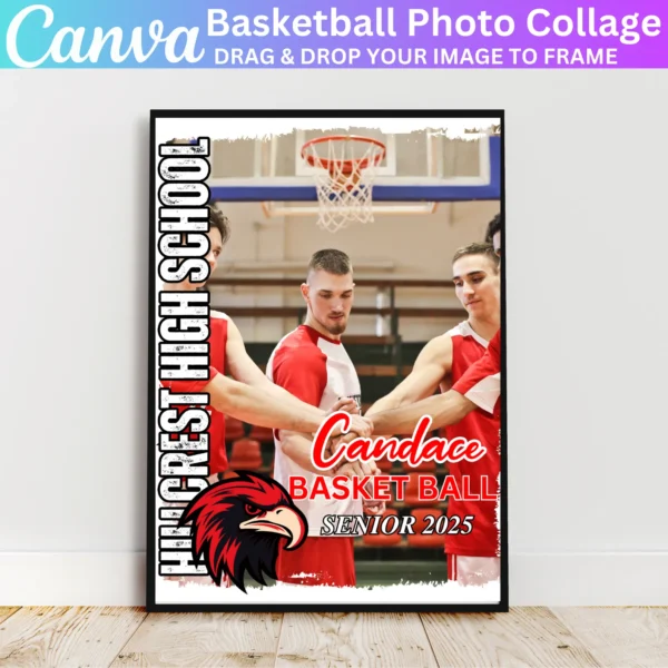 Create custom Basketball Frame Designs with this Canva Editable Template. Perfect for team photos, senior year keepsakes, or personalized gifts. Easily drag and drop images, team logos, and player names to create a custom design using Canva’s simple tools.