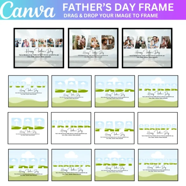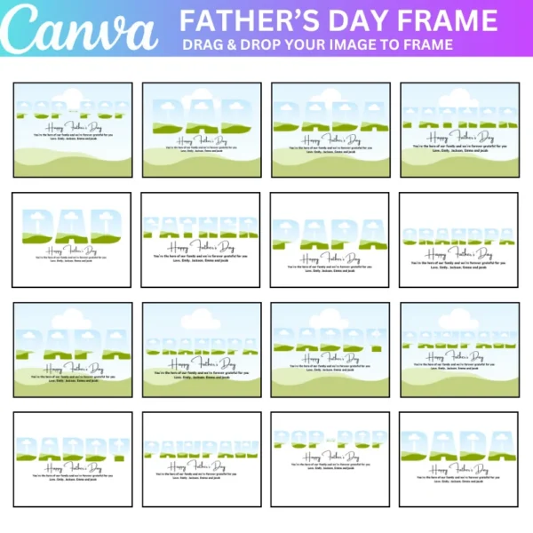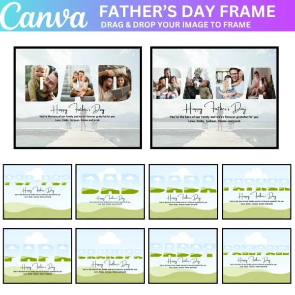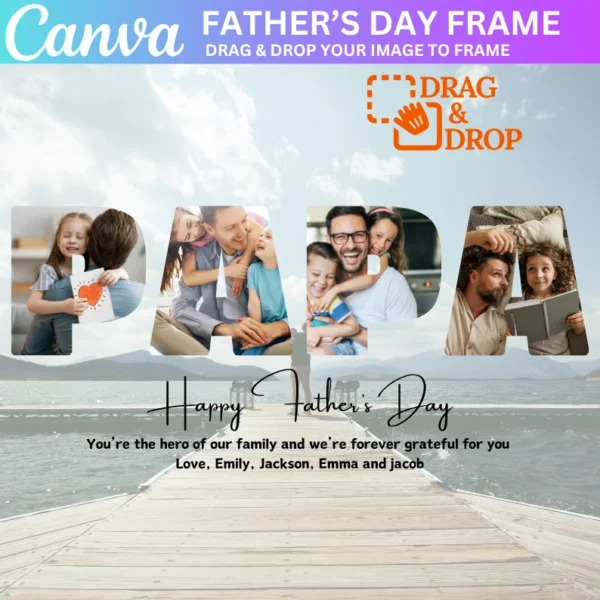 Celebrate the special fathers in your life with the Daddy Canva Editable Frame Template. This customizable template allows you to create unique photo frames for Dad, Papa, or Grandpa. Easily add your own photos, messages, and designs to create a personalized photo collage or print, making it the perfect Father’s Day gift, birthday present, or keepsake.