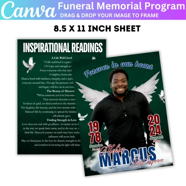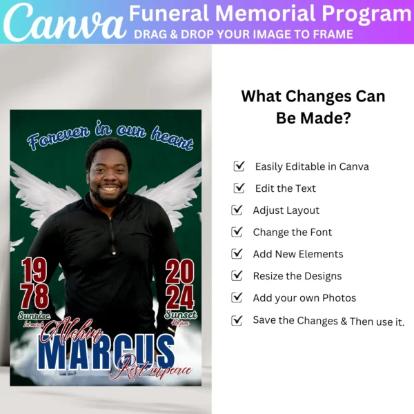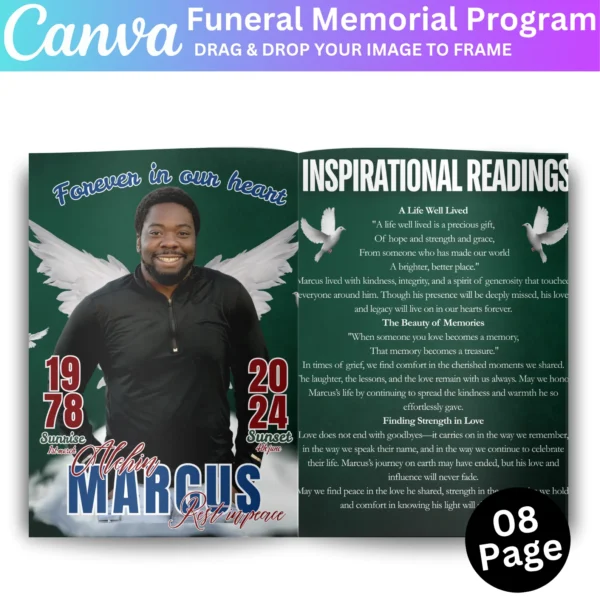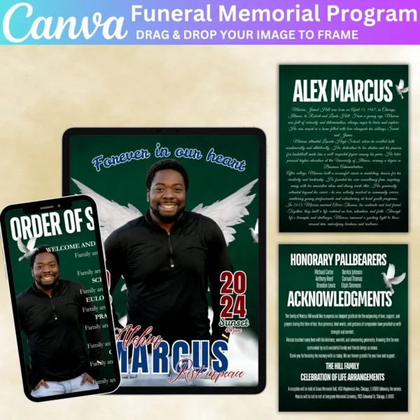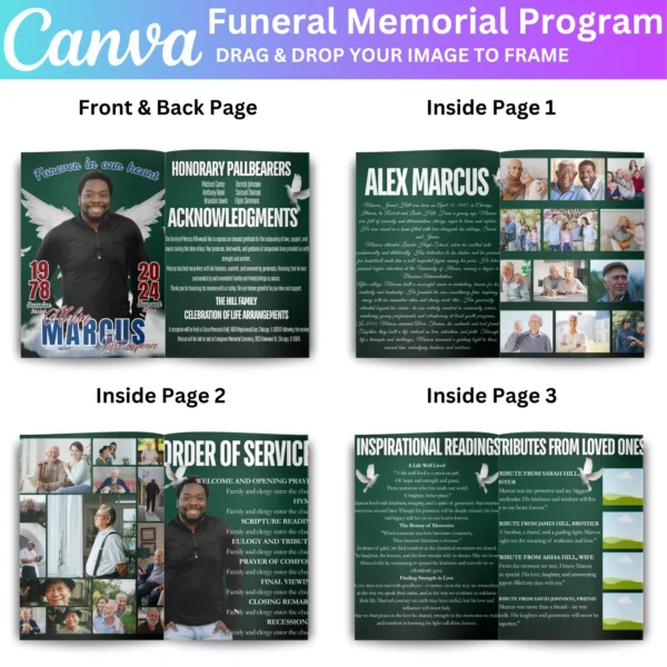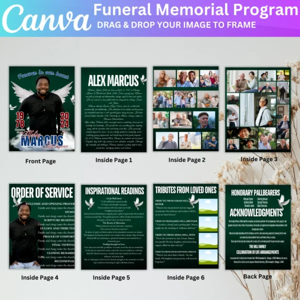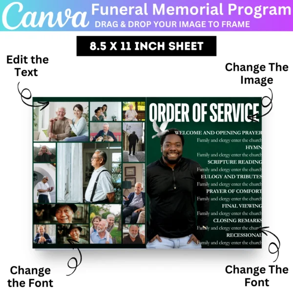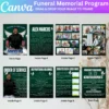 Create a beautiful and heartfelt tribute with the Green Funeral Memorial Program Canva Editable Template. This customizable template allows you to design a meaningful memorial program for your loved one, featuring an obituary, life celebration details, and personal messages. This digital download provides an easy-to-edit Canva file, allowing you to personalize the program with photos and text.
