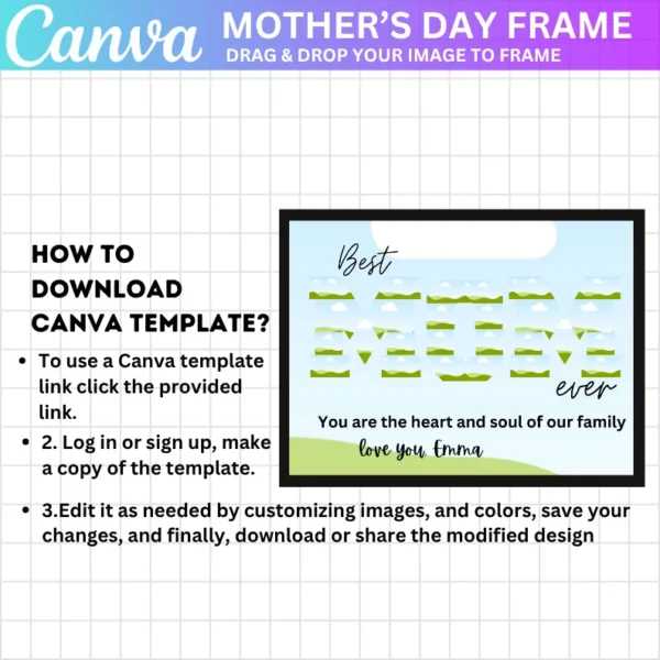 Celebrate the amazing mom in your life with the Mom Photo Collage Canva Template. This editable template allows you to create a heartfelt, personalized photo frame or collage for Mom. Featuring the phrase “Best Mom in the World,” it’s perfect for a meaningful Mother’s Day gift. Simply drag and drop your favorite photos, edit the text in Canva, and download the design as a high-quality PDF.